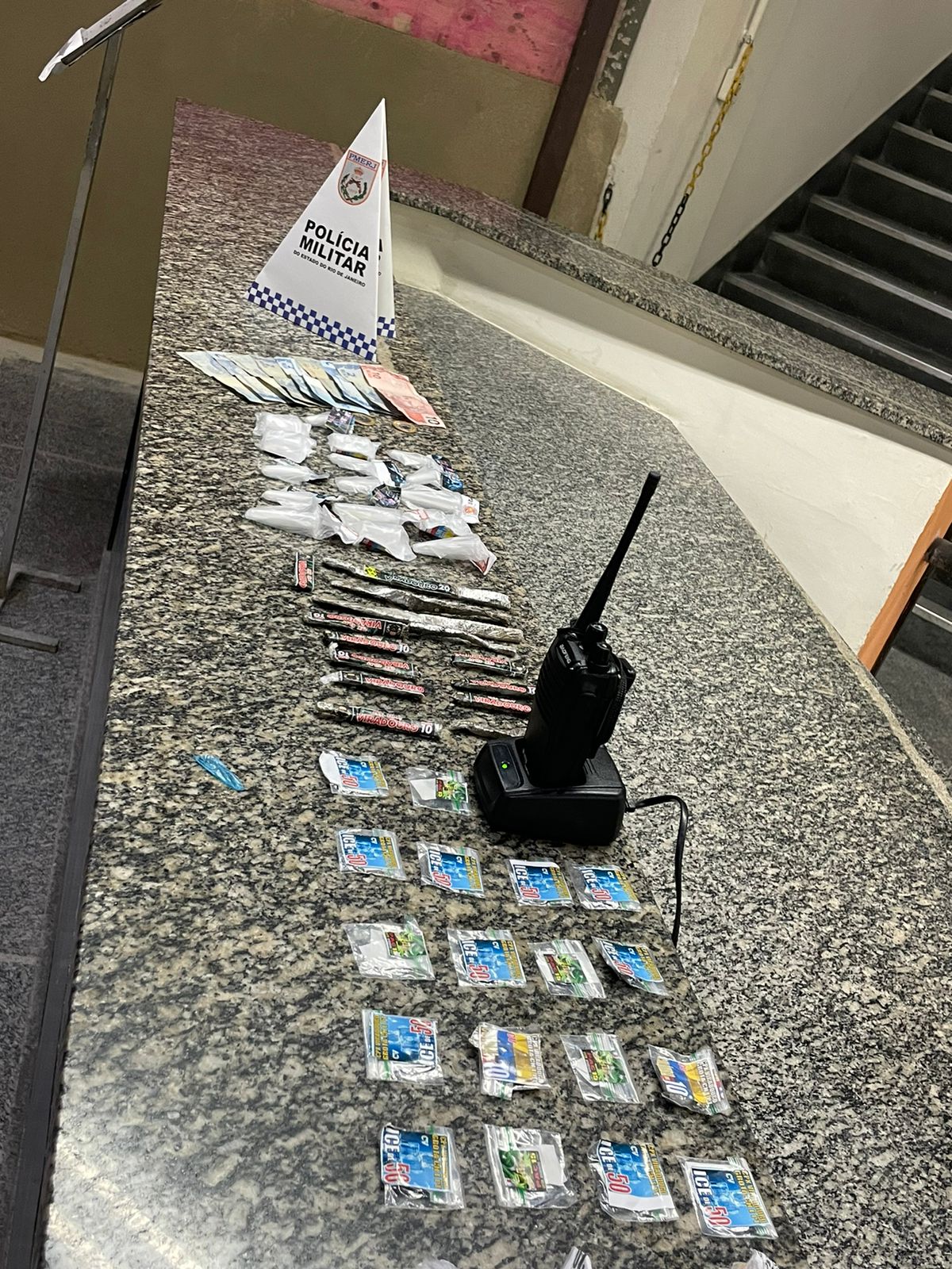 Policiais militares do 12º BPM (Niterói), com base em informações do Disque Denúncia, estiveram nodia 16 de maio, na Rua Nossa Senhora das Graças, no Complexo Viradouro, no bairro Santa Rosa, em Niterói, e após apurarem a denúncia, prenderam um homem em posse de 32 invólucros de Maconha, 16 pinos de Cocaína, 10 pedras de Crack, um radio transmissor e R$ 30,00 em espécie.