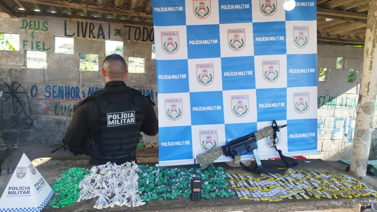 Foram apreendidas uma Carabina Cal. 380 mm, uma munição intacta, 460 sacolés de Cocaína, 112 trouxinhas de Maconha, 70 pinos de Cocaína e um rádio transmissor.