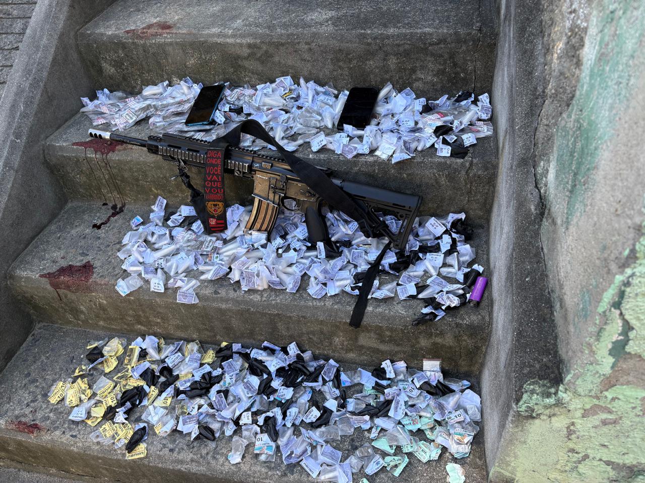Equipe do 3° BPM (Meier), baseada em infornações recebidas pelo Disque Denúncia sobre tráfico de drogas, esteve nesta terça-feira (20), na Rua Manuel Corrêa, no Morro do Urubu, em Piedade, Zona Norte do Rio, e após verificarem a denúncia, apreenderam um fuzil MagPul Cal. 5,56mm, dez munições Cal.5,56 mm, um carregador, um rádio transmissor, 340 pinos de Cocaína, 15 papelotes de Ice, 150 tabletes de Maconha e 90 papelotes de Crack.