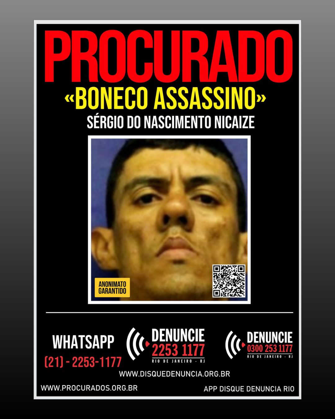 Sérgio do Nascimento Nicaize, o "Boneco da Serrinha ou Boneco Assassino", 40 anos, se encontra na condição de Evadido do Sistema Penitenciário, desde outubro de 2017.