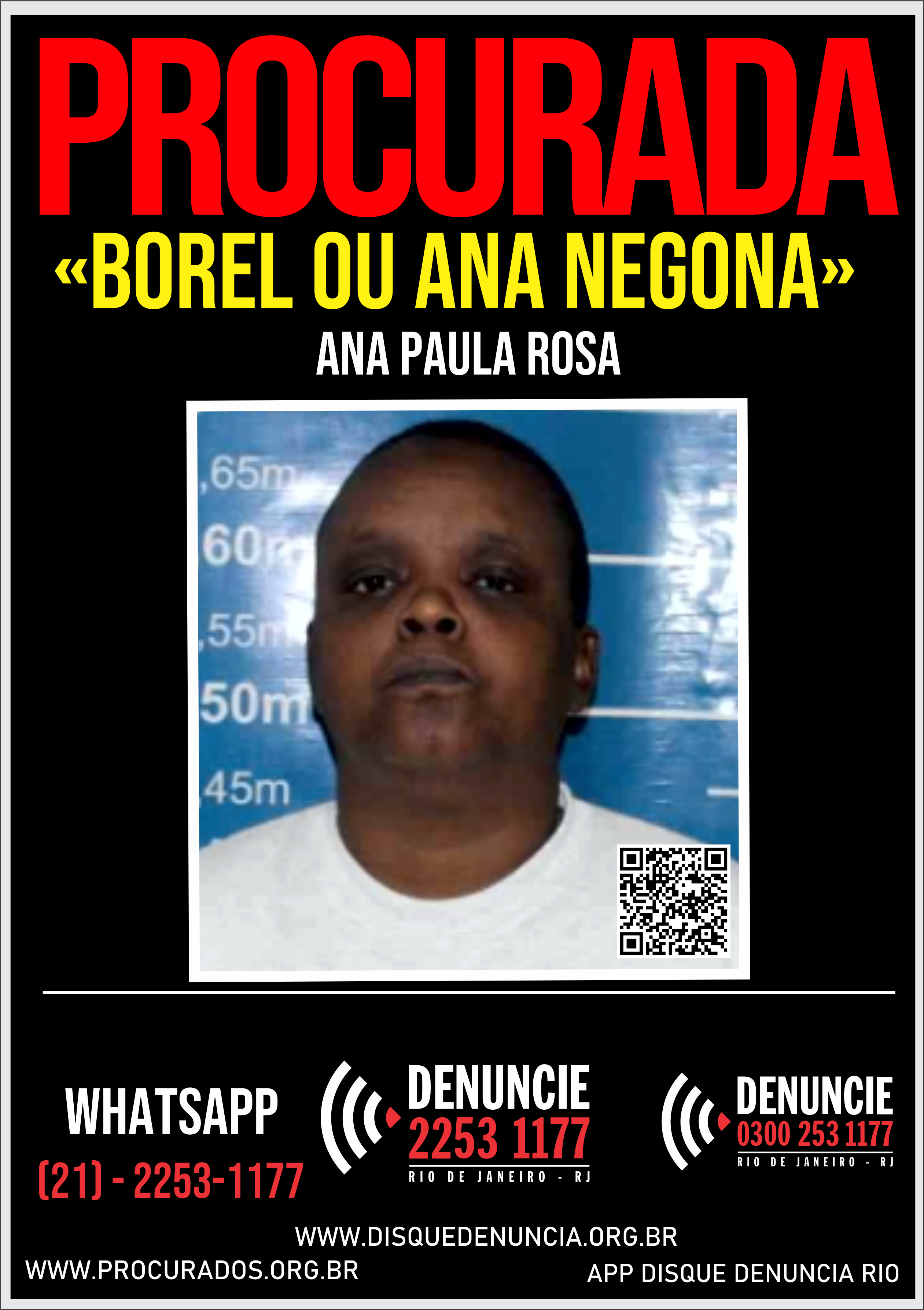 Ana Paula Rosa, vulgo "Ana Negona ou Nega ou Borel", de 51 anos, se encontra na condição de Evadida do Sistema Penitenciário, desde o dia 18 de agosto de 2024, do INSTITUTO PENAL OSCAR STEVENSON.