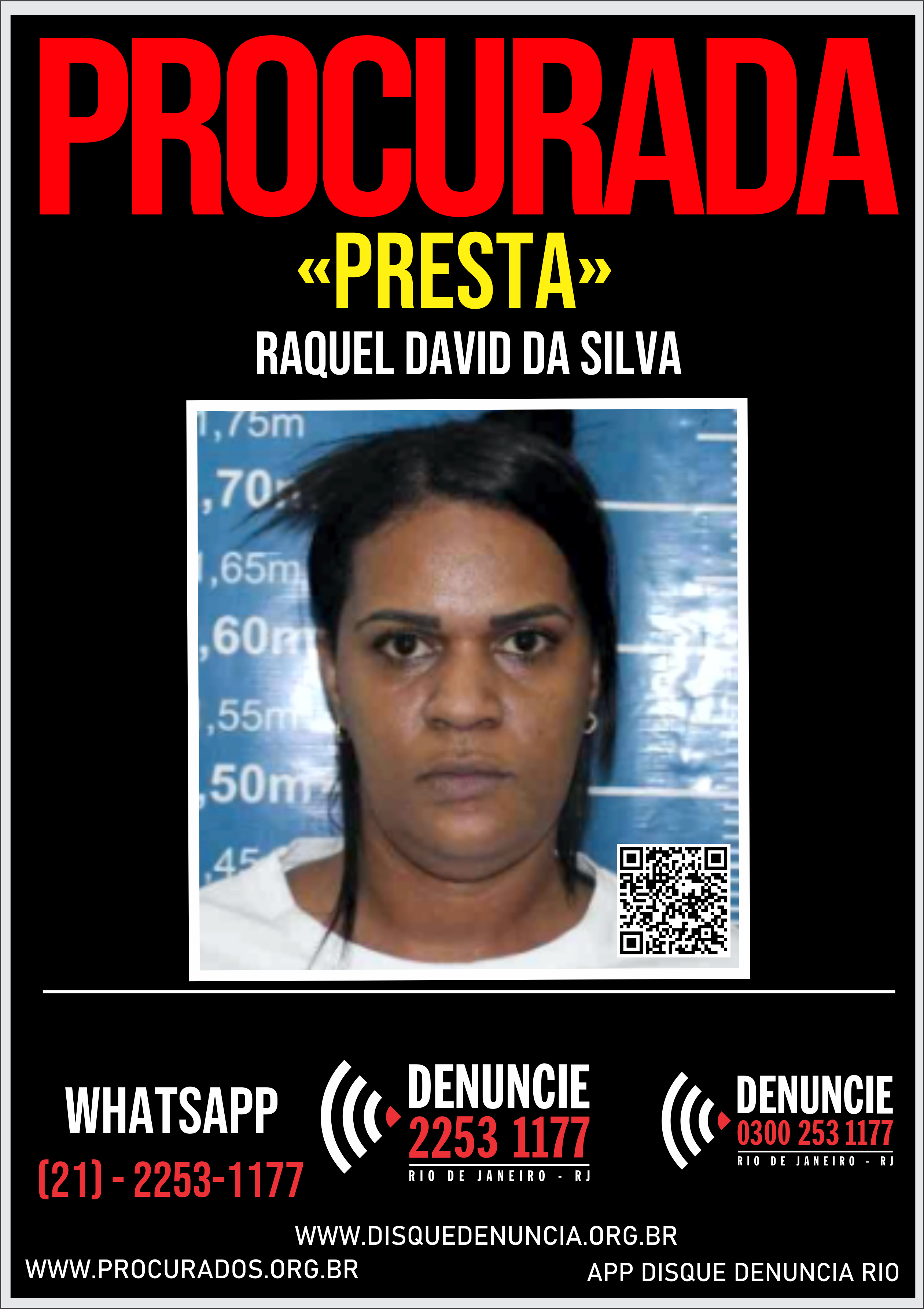 RAQUEL DAVID DA SILVA, vulgo "Preta", se encontra na condição de Evadida do Sistema Penitenciário, desde 30 de dezembro de 2025, após receber o benefício de Indulto de Natal de 2025, e não retornar mais sua unidade prisional.